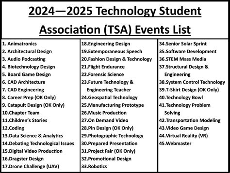 the technology student association (tsa) is a national student organization created to develop skills in science, technology,. tsa offers 37 middle school competitions. 2024 national tsa conference.